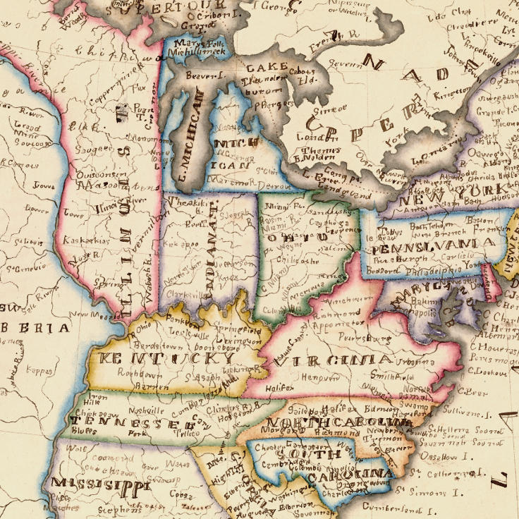 Just after the Revolution, thousands of young girls began to be educated outside the home for the first time in American history. Young Catharine Cook displays her knowledge of geography, art, and penmanship in this painstakingly produced map made as a school exercise. Notice her careful attention to detail, as well as her creative spelling of place names. Chapter four explores this and other maps that richly capture the complexities of antebellum America.